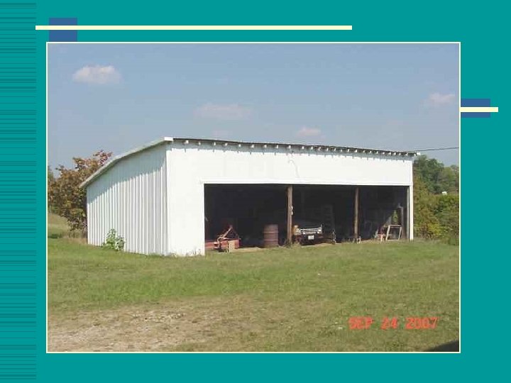 OVERVIEW OF FARM w 16+ rolling acres w 1/3 mile graveled lane w Surveyed 2003 w 2 -Story house w/basement & attic w Metal 2 -car garage w/large workshop w 1 acre of fruit trees w Huge 2 -story wood barn w Metal 2 -bay garage w/loft w Metal 3 -bay garage w/large storage area w 2 Concrete blockbuildings w/metal roofs w Vinyl-clad storage building
