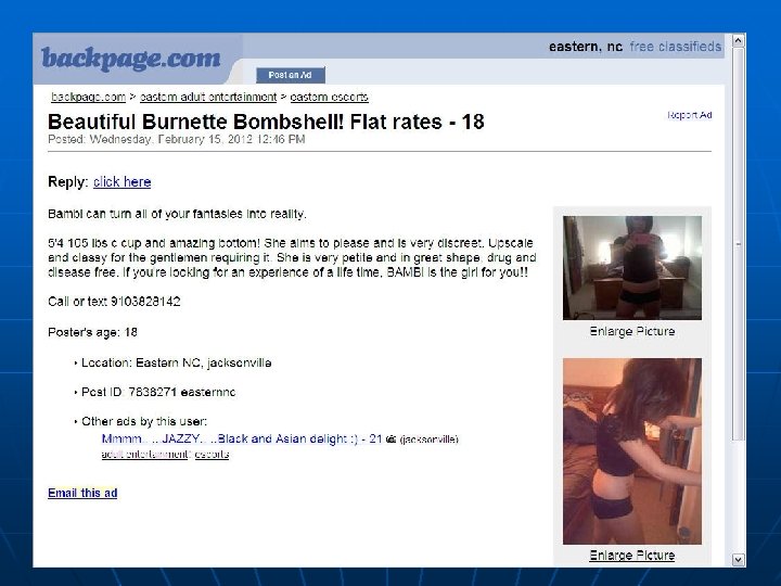 Domestic Minor Sex Trafficking n 11 -14 years old-average of first being prostituted n No such thing as a “child prostitute” n These are abused children n Victims of sex trafficking