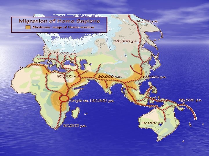 Conclusion • DNA sequencing and fossil evidence shows that modern humans originated in Africa and migrated north out of African, then eventually to the rest of the world. • Oldest fossils of modern humans are found in Africa dating around 160, 000 years old.