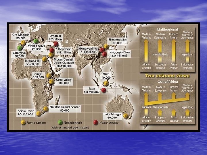 Two Main Theories • Out of Africa Theory – suggests that Homo erectus evolved into Homo sapiens in Africa, and then ventured out of Africa and dispersed to all around the world. • Multi-regional Evolution Theory – suggests that Homo erectus ventured out of Africa and then evolved into modern man in several different locations through out the world.