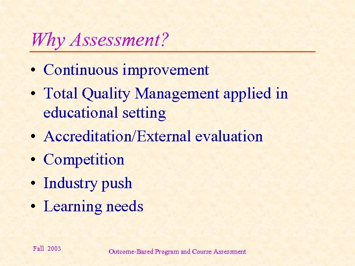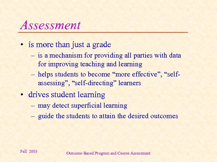Why Assessment? • Continuous improvement • Total Quality Management applied in educational setting • Accreditation/External evaluation • Competition • Industry push • Learning needs Fall 2003 Outcome-Based Program and Course Assessment