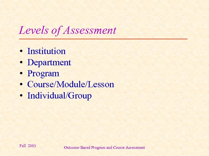 Levels of Assessment • • • Institution Department Program Course/Module/Lesson Individual/Group Fall 2003 Outcome-Based Program and Course Assessment