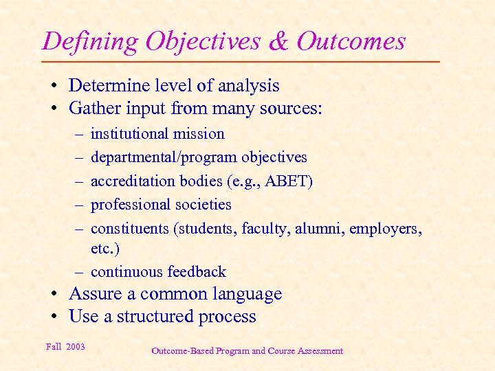 Defining Objectives & Outcomes • Determine level of analysis • Gather input from many sources: – – – institutional mission departmental/program objectives accreditation bodies (e. g. , ABET) professional societies constituents (students, faculty, alumni, employers, etc. ) – continuous feedback • Assure a common language • Use a structured process Fall 2003 Outcome-Based Program and Course Assessment