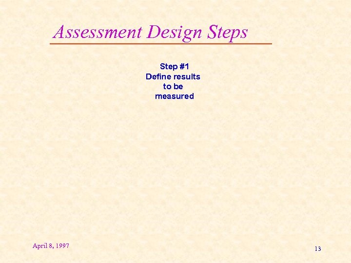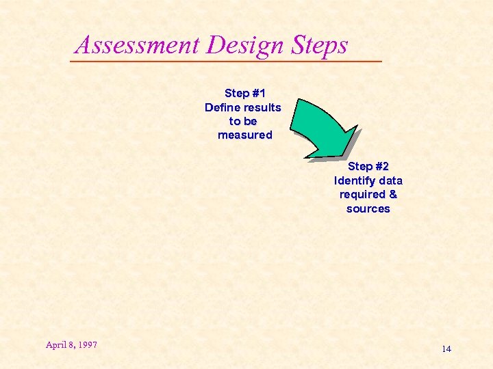 Assessment Design Steps Step #1 Define results to be measured April 8, 1997 13