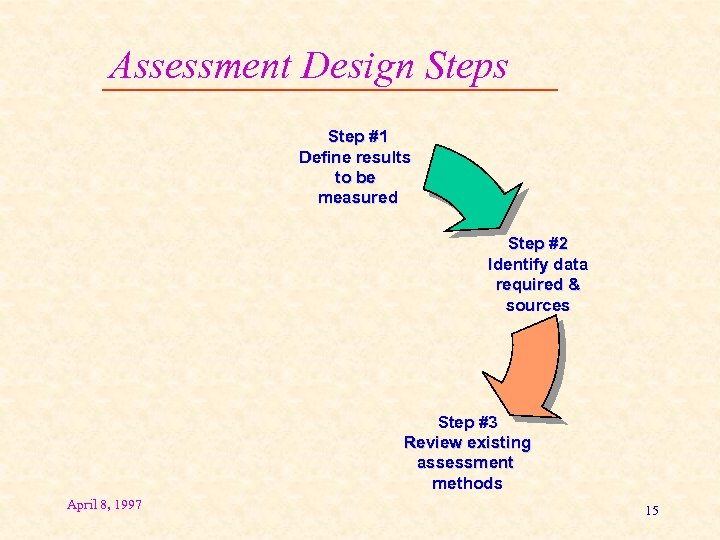 Assessment Design Steps Step #1 Define results to be measured Step #2 Identify data required & sources April 8, 1997 14