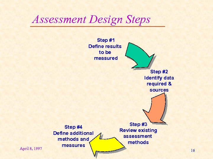 Assessment Design Steps Step #1 Define results to be measured Step #2 Identify data required & sources Step #3 Review existing assessment methods April 8, 1997 15