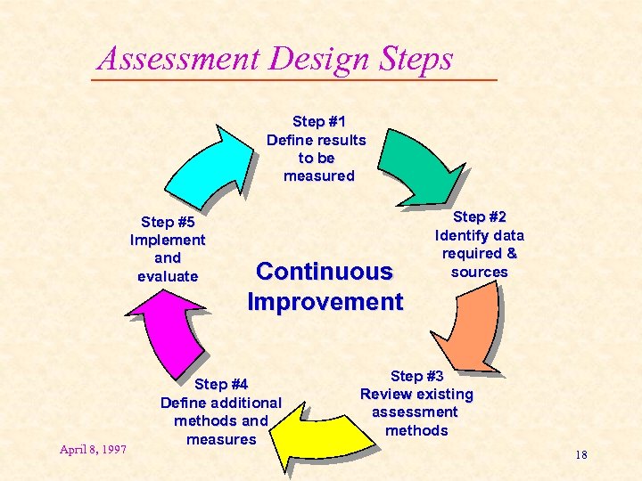 Assessment Design Steps Step #1 Define results to be measured Step #5 Implement and evaluate April 8, 1997 Step #4 Define additional methods and measures Step #2 Identify data required & sources Step #3 Review existing assessment methods 17