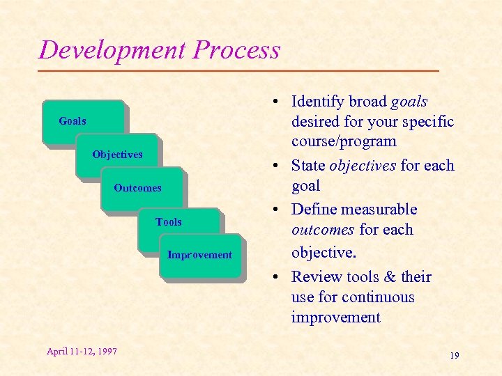 Development Process Goals Objectives Outcomes Tools Improvement April 11 -12, 1997 • Identify broad goals desired for your specific course/program • State objectives for each goal • Define measurable outcomes for each objective. • Review tools & their use for continuous improvement 19