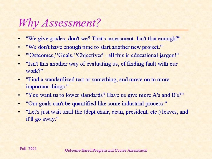 Why Assessment? • • "We give grades, don't we? That's assessment. Isn't that enough? " "We don't have enough time to start another new project. " "'Outcomes, ' 'Goals, ' 'Objectives' - all this is educational jargon!" "Isn't this another way of evaluating us, of finding fault with our work? " "Find a standardized test or something, and move on to more important things. " "You want us to lower standards? Have us give more A's and B's? " "Our goals can't be quantified like some industrial process. " "Let's just wait until the (dept chair, dean, president, etc. ) leaves, and it'll go away. " Fall 2003 Outcome-Based Program and Course Assessment