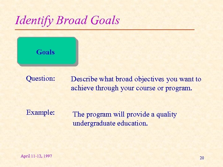 Identify Broad Goals Question: Describe what broad objectives you want to achieve through your course or program. Example: The program will provide a quality undergraduate education. April 11 -12, 1997 20
