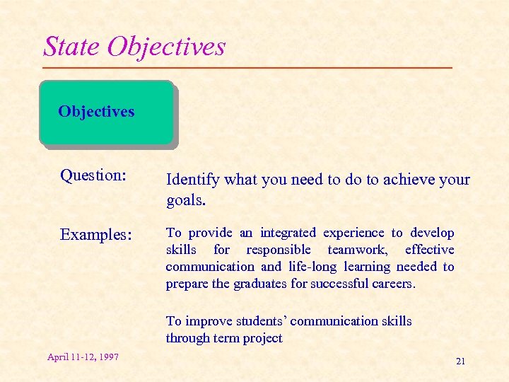 State Objectives Question: Identify what you need to do to achieve your goals. Examples: To provide an integrated experience to develop skills for responsible teamwork, effective communication and life-long learning needed to prepare the graduates for successful careers. To improve students’ communication skills through term project April 11 -12, 1997 21