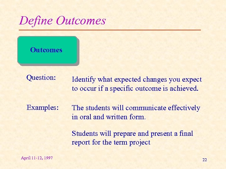 Define Outcomes Question: Identify what expected changes you expect to occur if a specific outcome is achieved. Examples: The students will communicate effectively in oral and written form. Students will prepare and present a final report for the term project April 11 -12, 1997 22