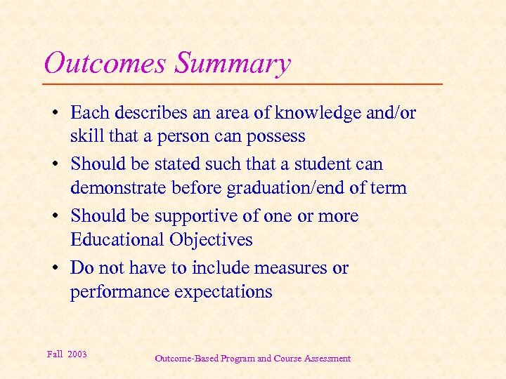Outcomes Summary • Each describes an area of knowledge and/or skill that a person can possess • Should be stated such that a student can demonstrate before graduation/end of term • Should be supportive of one or more Educational Objectives • Do not have to include measures or performance expectations Fall 2003 Outcome-Based Program and Course Assessment