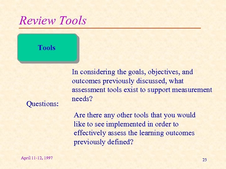 Review Tools Questions: In considering the goals, objectives, and outcomes previously discussed, what assessment tools exist to support measurement needs? Are there any other tools that you would like to see implemented in order to effectively assess the learning outcomes previously defined? April 11 -12, 1997 25