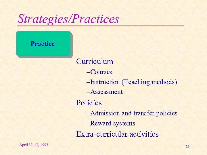 Strategies/Practices Practice Curriculum –Courses –Instruction (Teaching methods) –Assessment Policies –Admission and transfer policies –Reward systems Extra-curricular activities April 11 -12, 1997 26