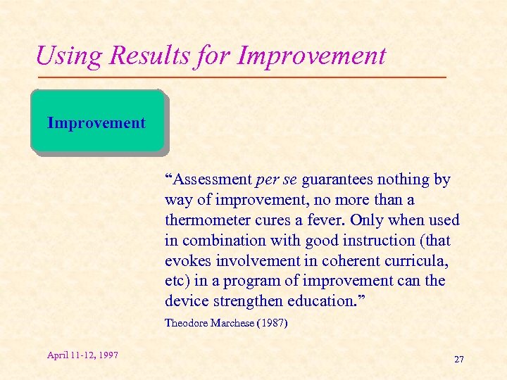 Using Results for Improvement “Assessment per se guarantees nothing by way of improvement, no more than a thermometer cures a fever. Only when used in combination with good instruction (that evokes involvement in coherent curricula, etc) in a program of improvement can the device strengthen education. ” Theodore Marchese (1987) April 11 -12, 1997 27
