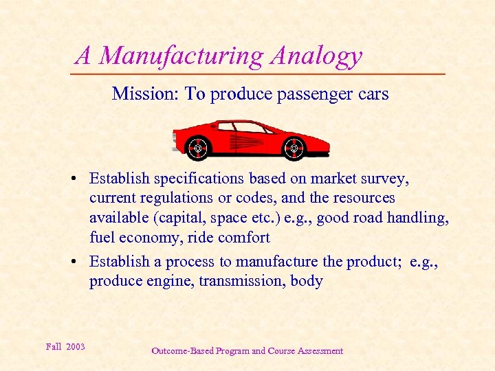 A Manufacturing Analogy Mission: To produce passenger cars • Establish specifications based on market survey, current regulations or codes, and the resources available (capital, space etc. ) e. g. , good road handling, fuel economy, ride comfort • Establish a process to manufacture the product; e. g. , produce engine, transmission, body Fall 2003 Outcome-Based Program and Course Assessment