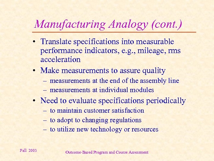 Manufacturing Analogy (cont. ) • Translate specifications into measurable performance indicators, e. g. , mileage, rms acceleration • Make measurements to assure quality – measurements at the end of the assembly line – measurements at individual modules • Need to evaluate specifications periodically – to maintain customer satisfaction – to adopt to changing regulations – to utilize new technology or resources Fall 2003 Outcome-Based Program and Course Assessment