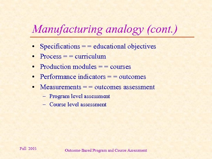 Manufacturing analogy (cont. ) • • • Specifications = = educational objectives Process = = curriculum Production modules = = courses Performance indicators = = outcomes Measurements = = outcomes assessment – Program level assessment – Course level assessment Fall 2003 Outcome-Based Program and Course Assessment