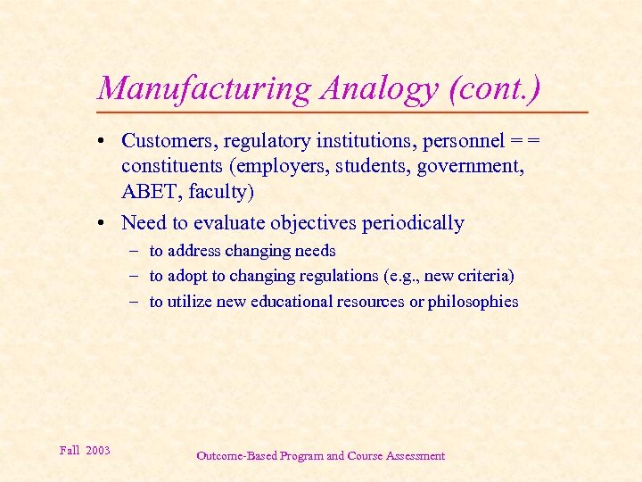 Manufacturing Analogy (cont. ) • Customers, regulatory institutions, personnel = = constituents (employers, students, government, ABET, faculty) • Need to evaluate objectives periodically – to address changing needs – to adopt to changing regulations (e. g. , new criteria) – to utilize new educational resources or philosophies Fall 2003 Outcome-Based Program and Course Assessment