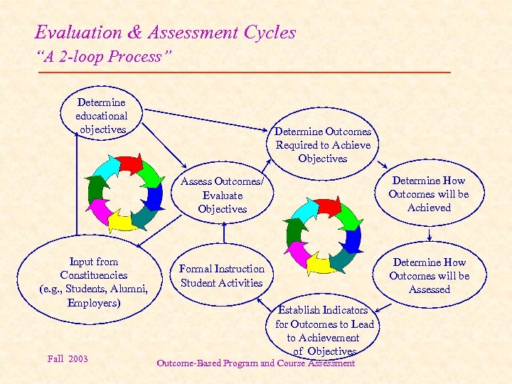 Evaluation & Assessment Cycles “A 2 -loop Process” Determine educational objectives Determine Outcomes Required to Achieve Objectives Assess Outcomes/ Evaluate Objectives Input from Constituencies (e. g. , Students, Alumni, Employers) Fall 2003 Determine How Outcomes will be Achieved Formal Instruction Student Activities Determine How Outcomes will be Assessed Establish Indicators for Outcomes to Lead to Achievement of Objectives Outcome-Based Program and Course Assessment
