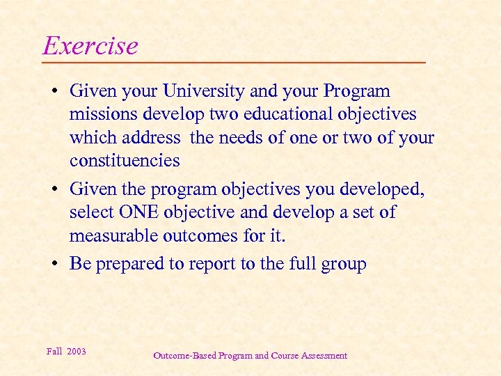 Exercise • Given your University and your Program missions develop two educational objectives which address the needs of one or two of your constituencies • Given the program objectives you developed, select ONE objective and develop a set of measurable outcomes for it. • Be prepared to report to the full group Fall 2003 Outcome-Based Program and Course Assessment