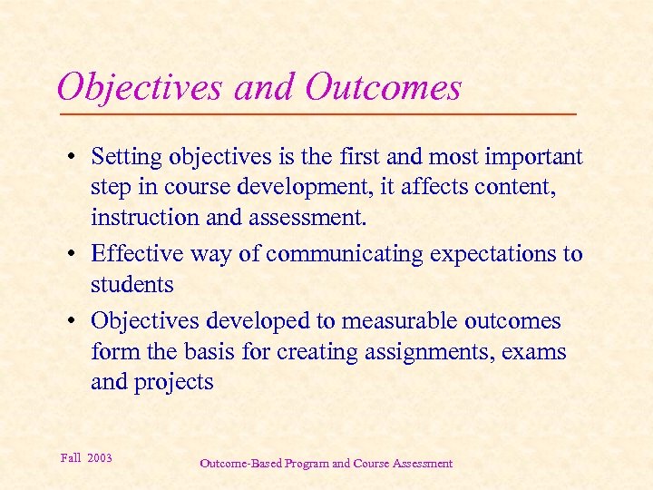 Objectives and Outcomes • Setting objectives is the first and most important step in course development, it affects content, instruction and assessment. • Effective way of communicating expectations to students • Objectives developed to measurable outcomes form the basis for creating assignments, exams and projects Fall 2003 Outcome-Based Program and Course Assessment