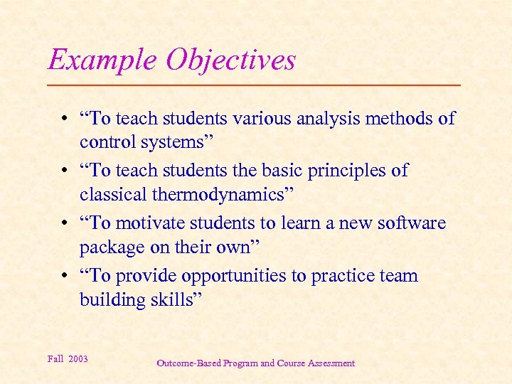 Example Objectives • “To teach students various analysis methods of control systems” • “To teach students the basic principles of classical thermodynamics” • “To motivate students to learn a new software package on their own” • “To provide opportunities to practice team building skills” Fall 2003 Outcome-Based Program and Course Assessment