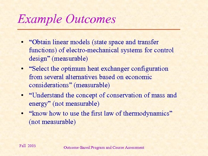 Example Outcomes • “Obtain linear models (state space and transfer functions) of electro-mechanical systems for control design” (measurable) • “Select the optimum heat exchanger configuration from several alternatives based on economic considerations” (measurable) • “Understand the concept of conservation of mass and energy” (not measurable) • “know how to use the first law of thermodynamics” (not measurable) Fall 2003 Outcome-Based Program and Course Assessment