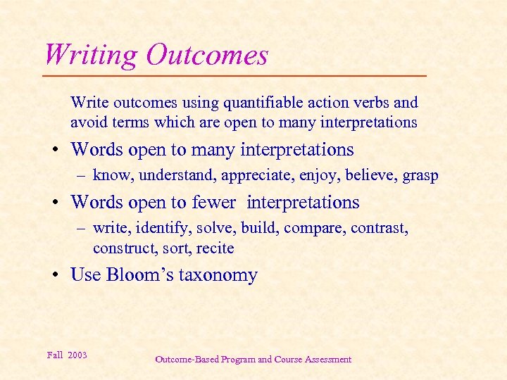 Writing Outcomes Write outcomes using quantifiable action verbs and avoid terms which are open to many interpretations • Words open to many interpretations – know, understand, appreciate, enjoy, believe, grasp • Words open to fewer interpretations – write, identify, solve, build, compare, contrast, construct, sort, recite • Use Bloom’s taxonomy Fall 2003 Outcome-Based Program and Course Assessment