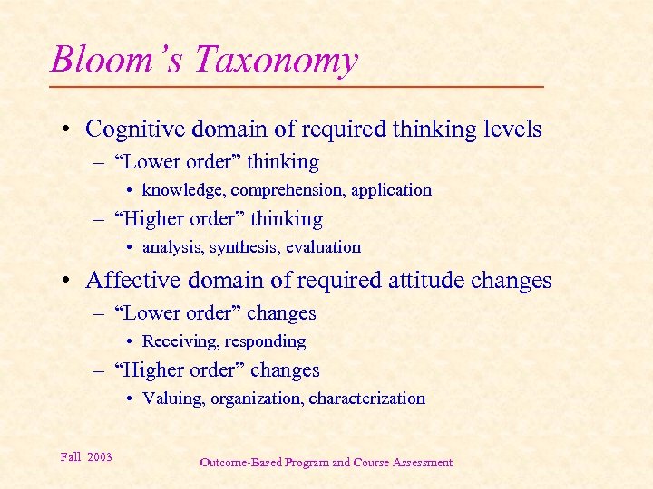 Bloom’s Taxonomy • Cognitive domain of required thinking levels – “Lower order” thinking • knowledge, comprehension, application – “Higher order” thinking • analysis, synthesis, evaluation • Affective domain of required attitude changes – “Lower order” changes • Receiving, responding – “Higher order” changes • Valuing, organization, characterization Fall 2003 Outcome-Based Program and Course Assessment