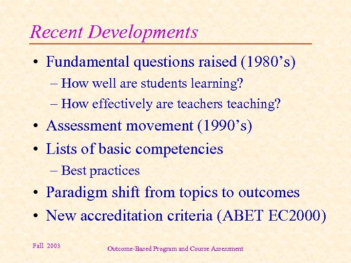 Recent Developments • Fundamental questions raised (1980’s) – How well are students learning? – How effectively are teachers teaching? • Assessment movement (1990’s) • Lists of basic competencies – Best practices • Paradigm shift from topics to outcomes • New accreditation criteria (ABET EC 2000) Fall 2003 Outcome-Based Program and Course Assessment