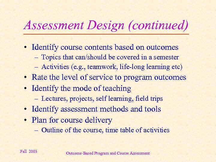 Assessment Design (continued) • Identify course contents based on outcomes – Topics that can/should be covered in a semester – Activities (e. g. , teamwork, life-long learning etc) • Rate the level of service to program outcomes • Identify the mode of teaching – Lectures, projects, self learning, field trips • Identify assessment methods and tools • Plan for course delivery – Outline of the course, time table of activities Fall 2003 Outcome-Based Program and Course Assessment