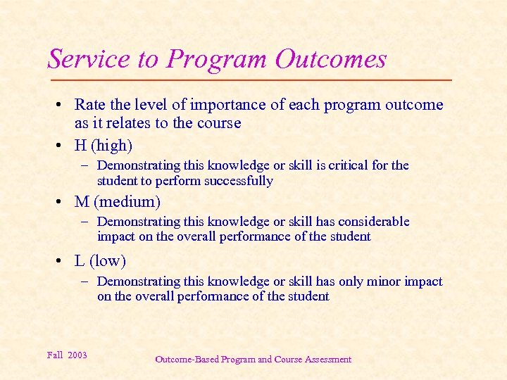 Service to Program Outcomes • Rate the level of importance of each program outcome as it relates to the course • H (high) – Demonstrating this knowledge or skill is critical for the student to perform successfully • M (medium) – Demonstrating this knowledge or skill has considerable impact on the overall performance of the student • L (low) – Demonstrating this knowledge or skill has only minor impact on the overall performance of the student Fall 2003 Outcome-Based Program and Course Assessment