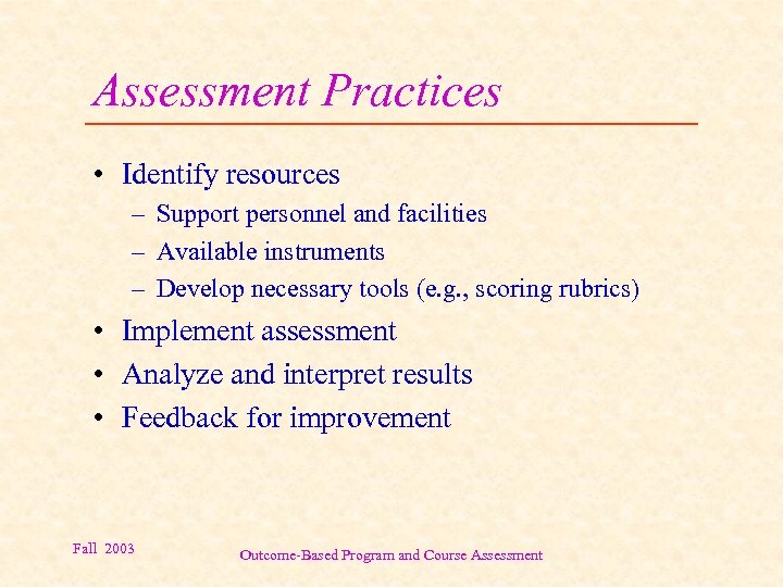 Assessment Practices • Identify resources – Support personnel and facilities – Available instruments – Develop necessary tools (e. g. , scoring rubrics) • Implement assessment • Analyze and interpret results • Feedback for improvement Fall 2003 Outcome-Based Program and Course Assessment