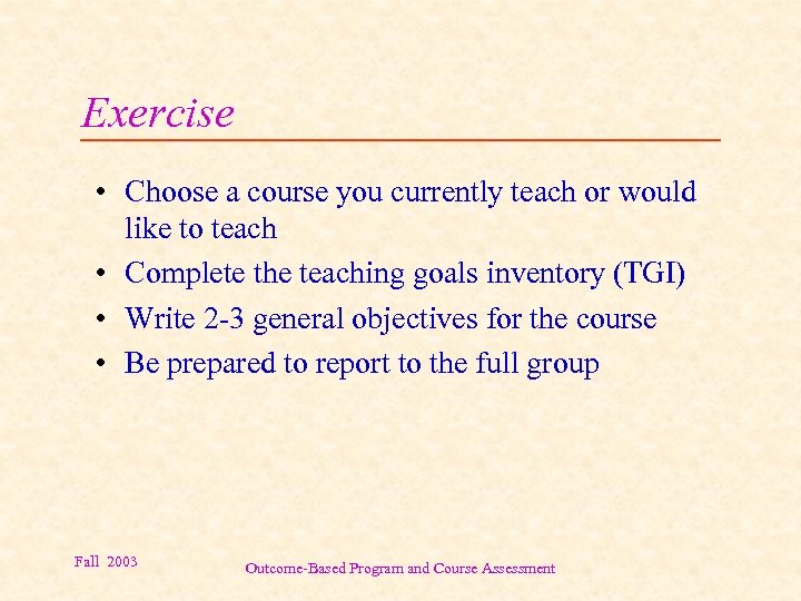 Exercise • Choose a course you currently teach or would like to teach • Complete the teaching goals inventory (TGI) • Write 2 -3 general objectives for the course • Be prepared to report to the full group Fall 2003 Outcome-Based Program and Course Assessment