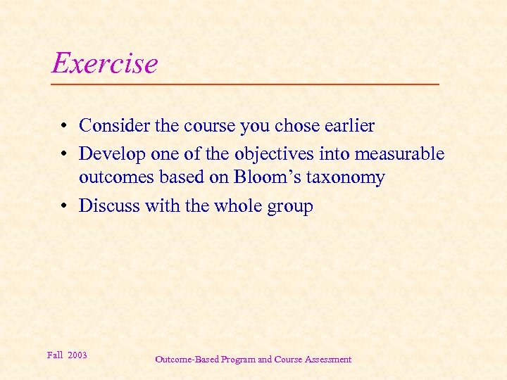 Exercise • Consider the course you chose earlier • Develop one of the objectives into measurable outcomes based on Bloom’s taxonomy • Discuss with the whole group Fall 2003 Outcome-Based Program and Course Assessment