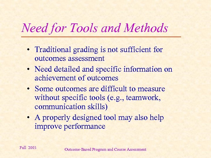 Need for Tools and Methods • Traditional grading is not sufficient for outcomes assessment • Need detailed and specific information on achievement of outcomes • Some outcomes are difficult to measure without specific tools (e. g. , teamwork, communication skills) • A properly designed tool may also help improve performance Fall 2003 Outcome-Based Program and Course Assessment