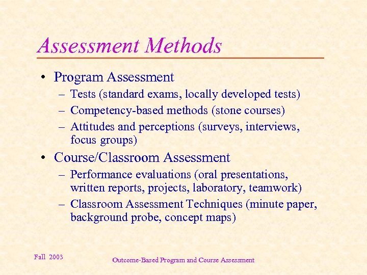 Assessment Methods • Program Assessment – Tests (standard exams, locally developed tests) – Competency-based methods (stone courses) – Attitudes and perceptions (surveys, interviews, focus groups) • Course/Classroom Assessment – Performance evaluations (oral presentations, written reports, projects, laboratory, teamwork) – Classroom Assessment Techniques (minute paper, background probe, concept maps) Fall 2003 Outcome-Based Program and Course Assessment