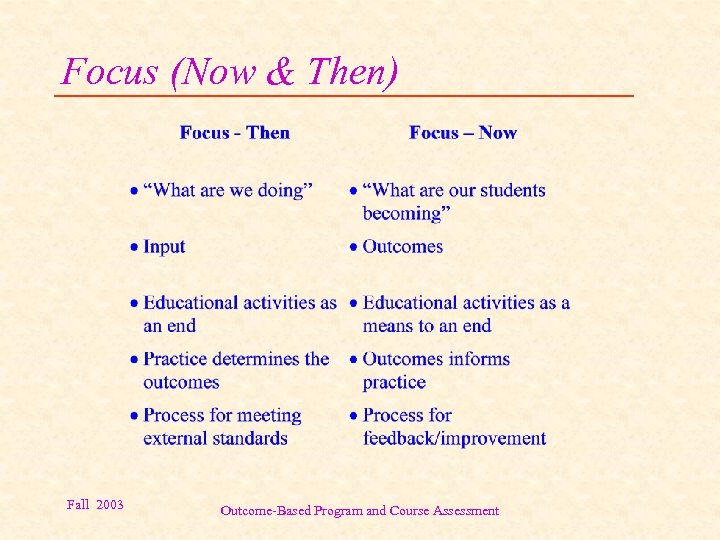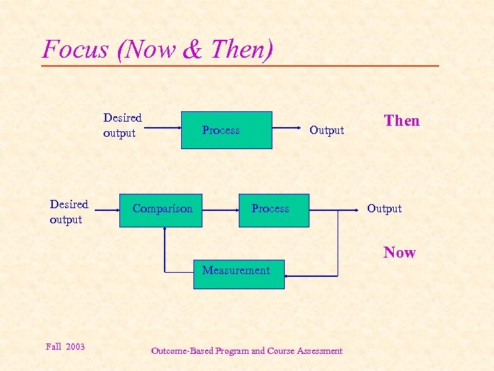 Focus (Now & Then) Desired output Process Comparison Output Process Then Output Now Measurement Fall 2003 Outcome-Based Program and Course Assessment