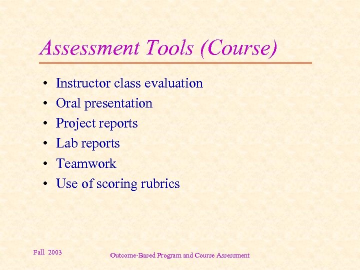 Assessment Tools (Course) • • • Instructor class evaluation Oral presentation Project reports Lab reports Teamwork Use of scoring rubrics Fall 2003 Outcome-Based Program and Course Assessment