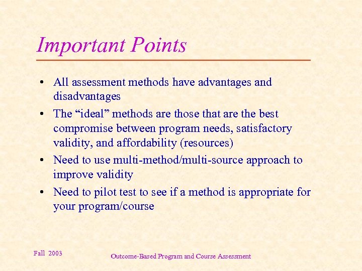 Important Points • All assessment methods have advantages and disadvantages • The “ideal” methods are those that are the best compromise between program needs, satisfactory validity, and affordability (resources) • Need to use multi-method/multi-source approach to improve validity • Need to pilot test to see if a method is appropriate for your program/course Fall 2003 Outcome-Based Program and Course Assessment