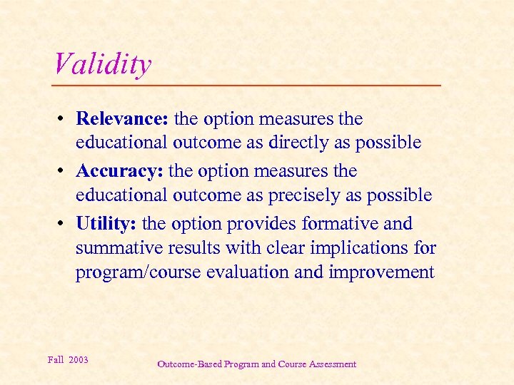 Validity • Relevance: the option measures the educational outcome as directly as possible • Accuracy: the option measures the educational outcome as precisely as possible • Utility: the option provides formative and summative results with clear implications for program/course evaluation and improvement Fall 2003 Outcome-Based Program and Course Assessment