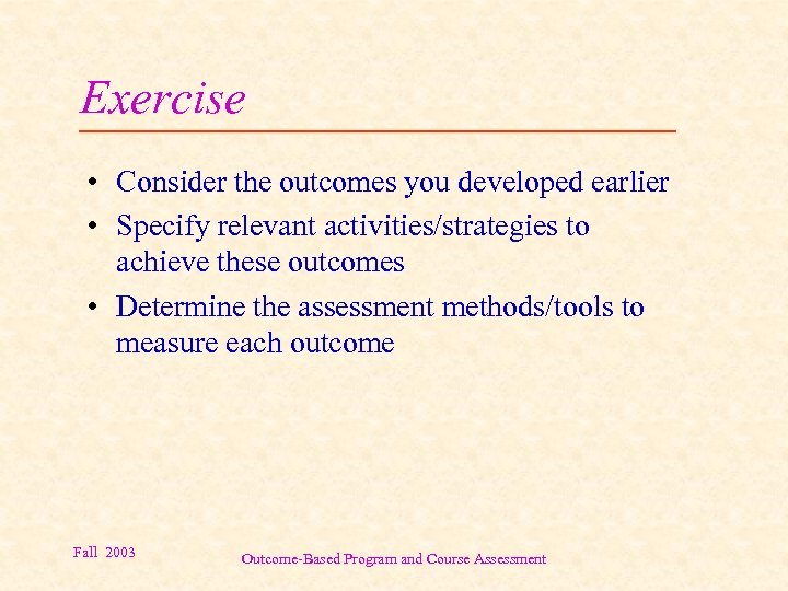Exercise • Consider the outcomes you developed earlier • Specify relevant activities/strategies to achieve these outcomes • Determine the assessment methods/tools to measure each outcome Fall 2003 Outcome-Based Program and Course Assessment