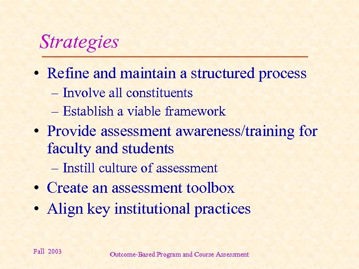 Strategies • Refine and maintain a structured process – Involve all constituents – Establish a viable framework • Provide assessment awareness/training for faculty and students – Instill culture of assessment • Create an assessment toolbox • Align key institutional practices Fall 2003 Outcome-Based Program and Course Assessment