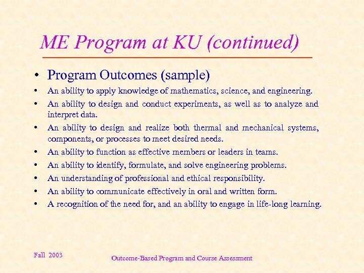 ME Program at KU (continued) • Program Outcomes (sample) • • An ability to apply knowledge of mathematics, science, and engineering. An ability to design and conduct experiments, as well as to analyze and interpret data. An ability to design and realize both thermal and mechanical systems, components, or processes to meet desired needs. An ability to function as effective members or leaders in teams. An ability to identify, formulate, and solve engineering problems. An understanding of professional and ethical responsibility. An ability to communicate effectively in oral and written form. A recognition of the need for, and an ability to engage in life-long learning. Fall 2003 Outcome-Based Program and Course Assessment