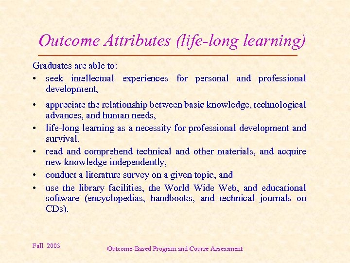 Outcome Attributes (life-long learning) Graduates are able to: • seek intellectual experiences for personal and professional development, • appreciate the relationship between basic knowledge, technological advances, and human needs, • life-long learning as a necessity for professional development and survival. • read and comprehend technical and other materials, and acquire new knowledge independently, • conduct a literature survey on a given topic, and • use the library facilities, the World Wide Web, and educational software (encyclopedias, handbooks, and technical journals on CDs). Fall 2003 Outcome-Based Program and Course Assessment