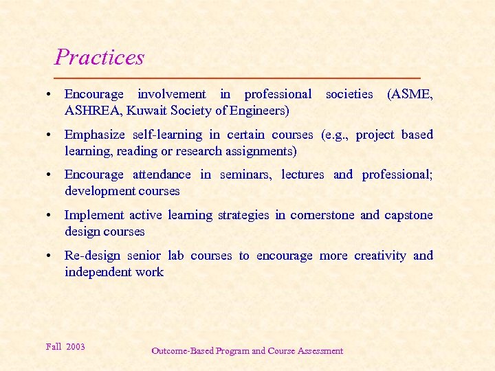 Practices • Encourage involvement in professional societies (ASME, ASHREA, Kuwait Society of Engineers) • Emphasize self-learning in certain courses (e. g. , project based learning, reading or research assignments) • Encourage attendance in seminars, lectures and professional; development courses • Implement active learning strategies in cornerstone and capstone design courses • Re-design senior lab courses to encourage more creativity and independent work Fall 2003 Outcome-Based Program and Course Assessment