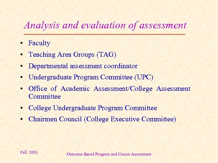 Analysis and evaluation of assessment • Faculty • Teaching Area Groups (TAG) • Departmental assessment coordinator • Undergraduate Program Committee (UPC) • Office of Academic Assessment/College Assessment Committee • College Undergraduate Program Committee • Chairmen Council (College Executive Committee) Fall 2003 Outcome-Based Program and Course Assessment