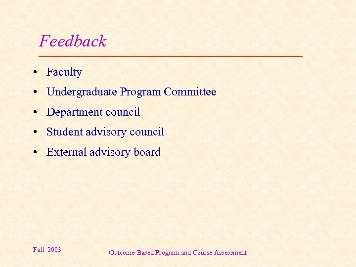 Feedback • Faculty • Undergraduate Program Committee • Department council • Student advisory council • External advisory board Fall 2003 Outcome-Based Program and Course Assessment